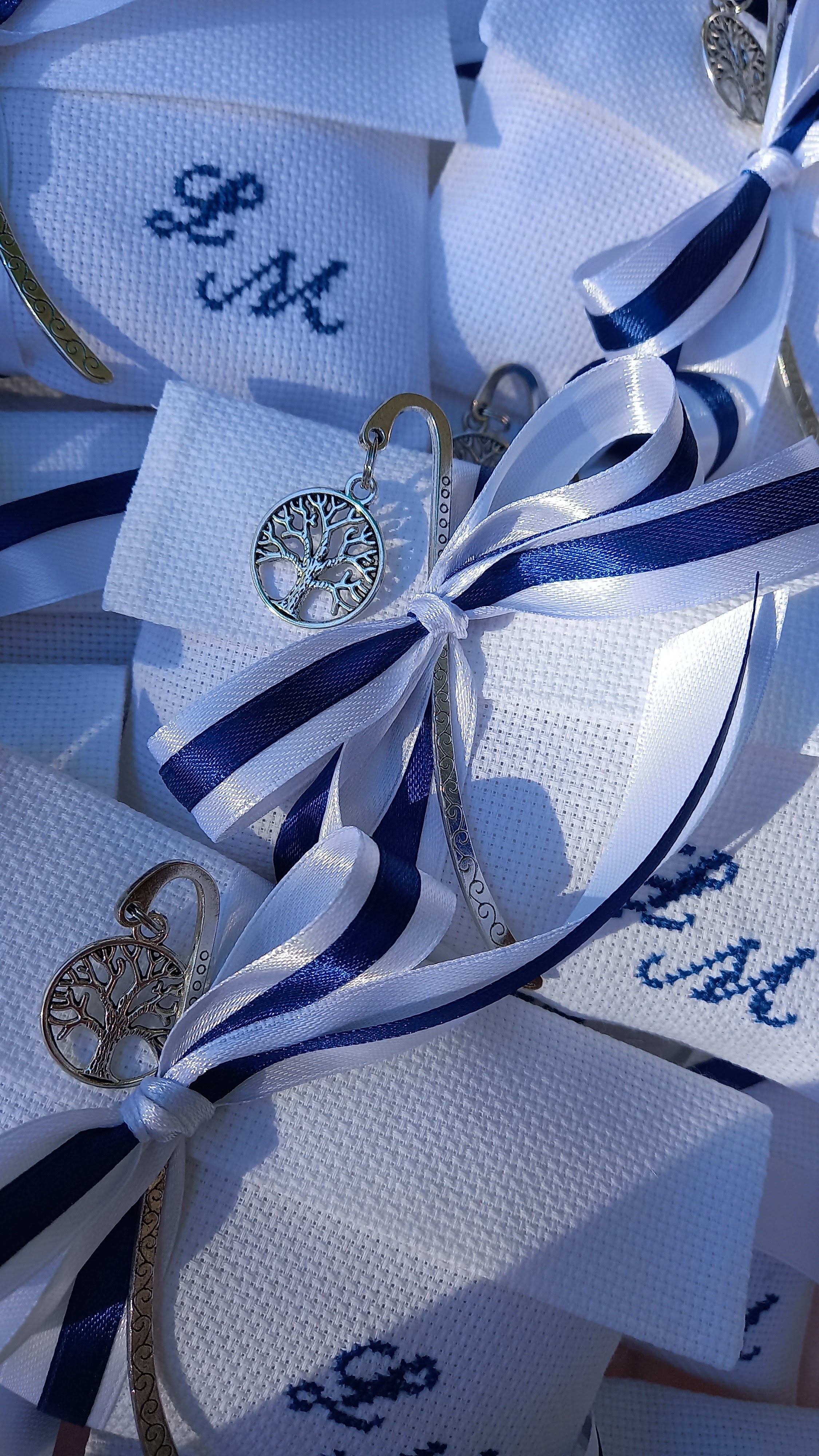 bomboniere prima comunione o cresima per gemelli composte da busta bianca con le iniziali dei nomi dei bambini ricamate a mano, misure 14 cm per 16 cm, comprensive di tulle 5 confetti mandorla o cioccolato della ditta Crispo e bigliettini con nomi e data ... più segnalibri albero della vita in silver plated lungo cm 9 .. per maggiori informazioni contattatemi anche tramite whatsapp