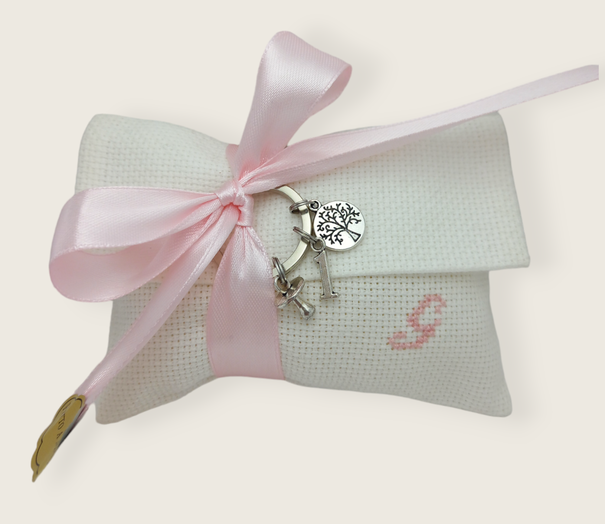 bomboniere per primo compleanno composte da busta bianca con iniziale del nome ricamata a mano, misure 12 cm per 15 cm, comprensive di tulle 5 confetti mandorla o cioccolato della ditta Crispo e bigliettino con nome e data .... più portachiavi con ciondoli in silver-plated per maggiori informazioni contattatemi oppure visita il sito bomboniere realizzate a mano per qualsiasi ricorrenza – Il Filo Magico bomboniere